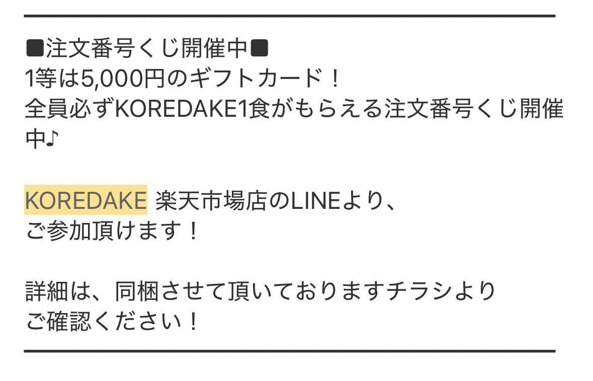 楽天で購入した際に発行される注文番号でくじが引けるキャンペーンも!1等は5,000円のギフトカードとかなり豪華な景品ラインナップでした💫